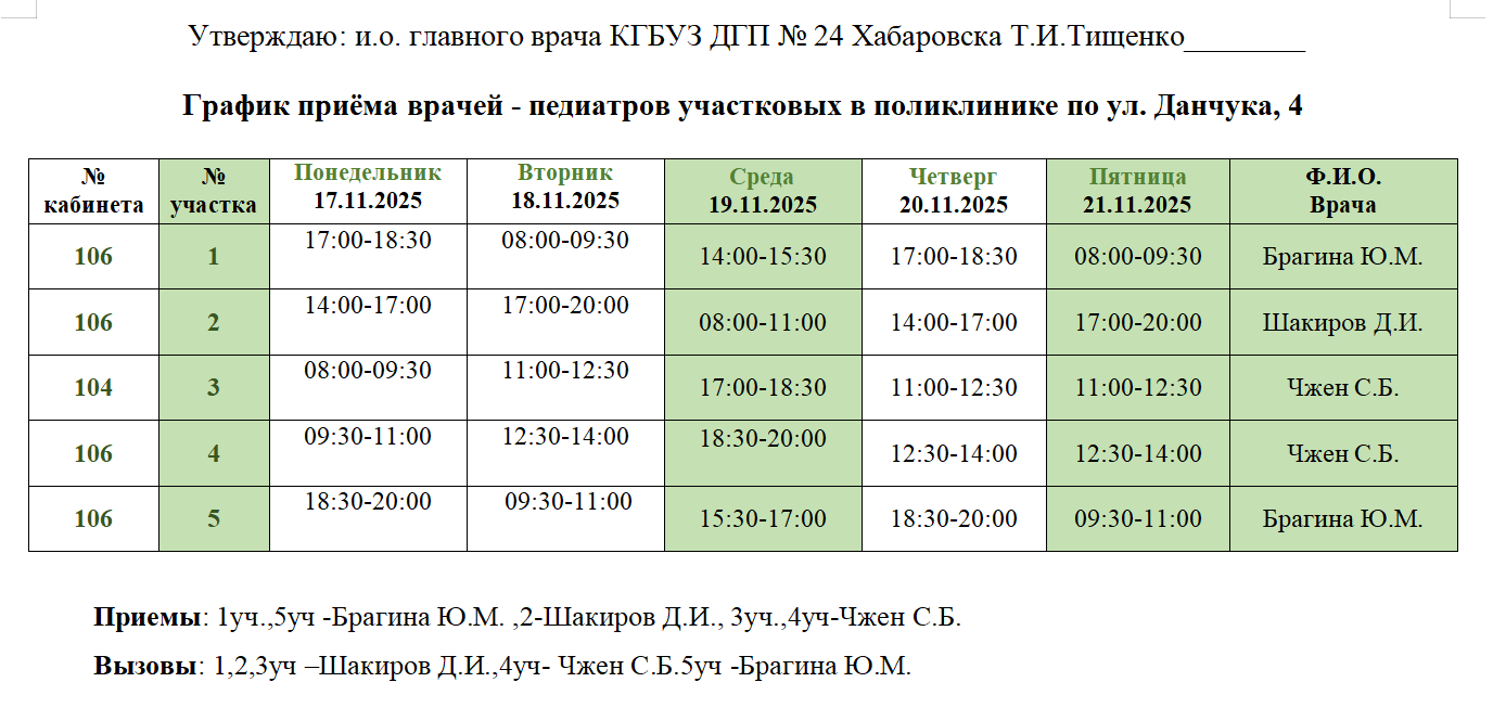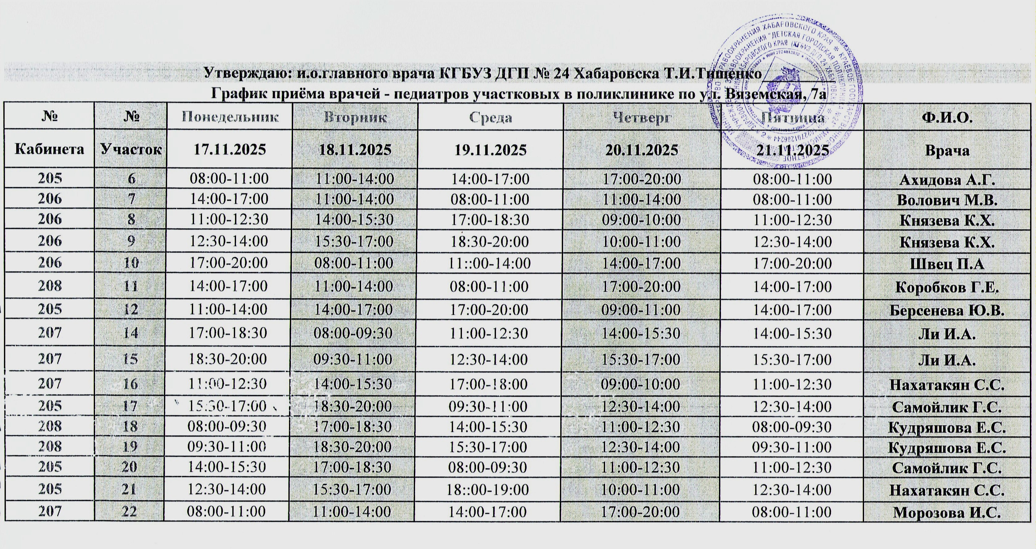 График работы врачей обновляется каждые четверг-пятницу, просим это учесть при записи на сайте госуслуг: gosuslugi.ru и uslugi27.ru. Если не получается записаться к врачу, значит ведутся технические работы на сайте госуслуг и услуги27. Либо на Вашего ребёнка не заведена электронная карта в МИС Барс, для этого вам необходимо подойти с документами (медицинский полис, свидетельство о рождении) в регистратуру.