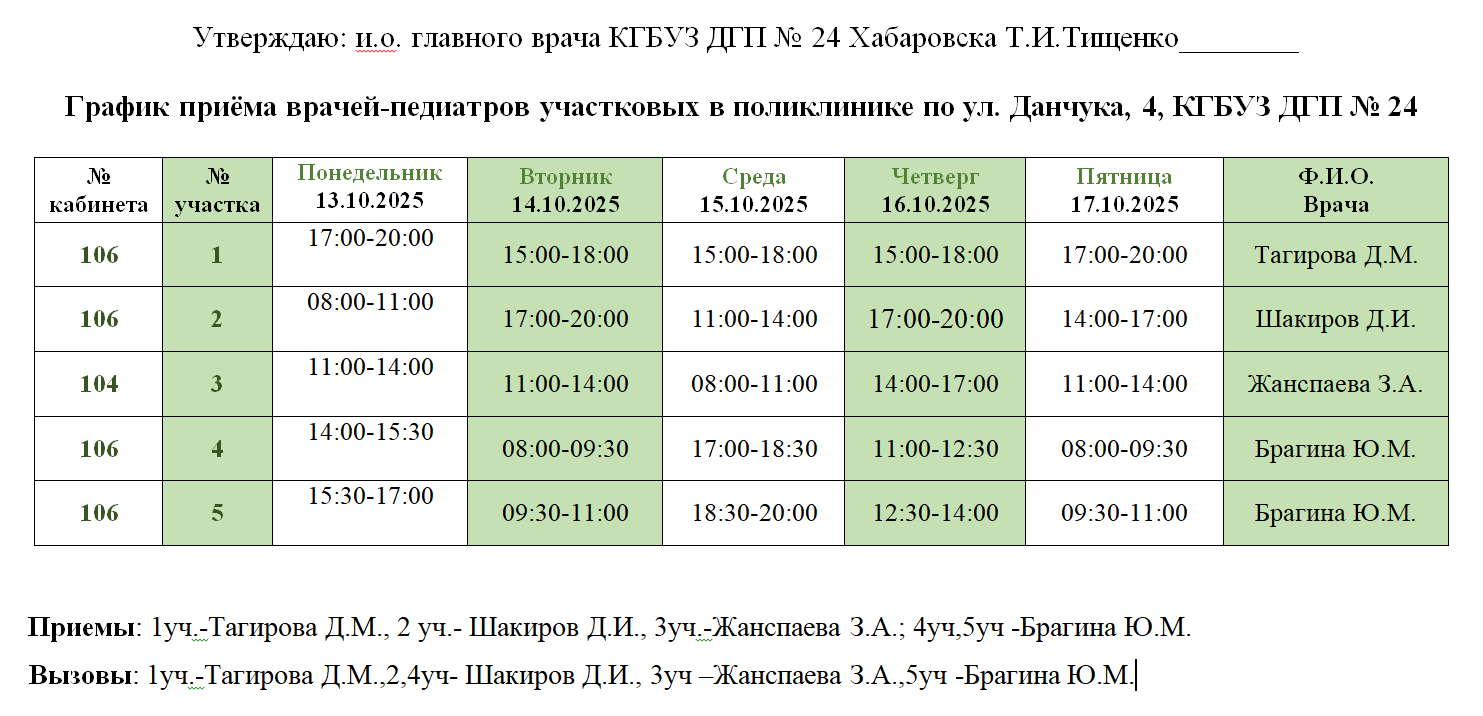 График работы врачей обновляется каждые четверг-пятницу, просим это учесть при записи на сайте госуслуг: gosuslugi.ru и uslugi27.ru. Если не получается записаться к врачу, значит ведутся технические работы на сайте госуслуг и услуги27. Либо на Вашего ребёнка не заведена электронная карта в МИС Барс, для этого вам необходимо подойти с документами (медицинский полис, свидетельство о рождении) в регистратуру.